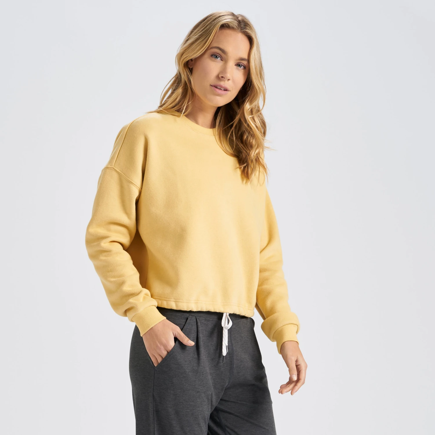 Sueded, stretchy and moisture wicking, the brushed french terry fabric of the Restore offers a soft touch and a smooth finish. The Restore Crew is a cozy crew neck with a drawstring cinch at the bottom hem so you can choose between fitted or relaxed. Great for running, training, yoga, traveling and chilling.